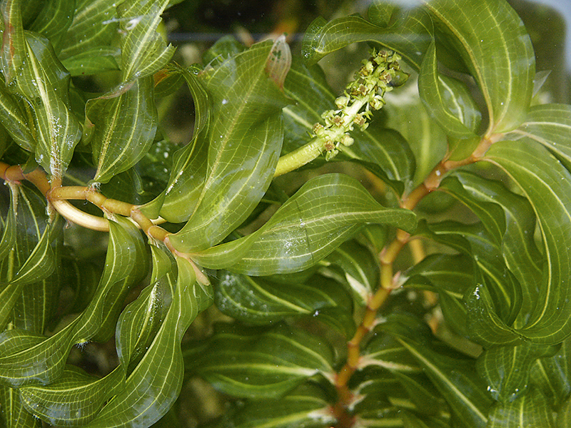 Rdest dlouholistý (Potamogeton praelongus) dokáže účinně přijímat HCO3–, a proto preferuje vody s vyšší konduktivitou a alkalinitou. V Podunajské nížině byl typickým prvkem rostlinných vodních společenstev v pozdním glaciálu a na začátku holocénu. Foto L. Adamec