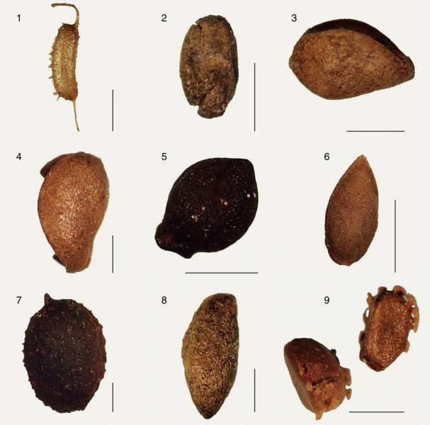 Rostlinné makrozbytky (semena a plody) identifikované v paleoekologických profilech z Podunajské nížiny. 1 – šejdračka bahenní (Zannichellia palustris), 2 – leknín bílý (Nymphaea alba), 3 – rdest Stuckenia filiformis, 4 – rdest dlouholistý (Potamogeton praelongus), 5 – mařice pilovitá (Cladium mariscus), 6 – kopřiva lužní (Urtica kioviensis), 7 – růžkatec bradavčitý (Ceratophyllum submersum), 8 – řečanka přímořská (Najas marina), 9 – stolístek klasnatý (Myriophyllum spicatum). Měřítko odpovídá 1 mm. Foto A. Šolcová