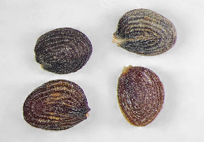 Penízek rolní (Thlaspi arvense) má semena 2 mm velká, plochá a oválného až vejcovitého tvaru. Na jedné straně je viditelný oddělený kořínek, což je činí asymetrickými. Povrch osemení je lesklý, se spirálovitým rýhováním. Foto J. Moravec