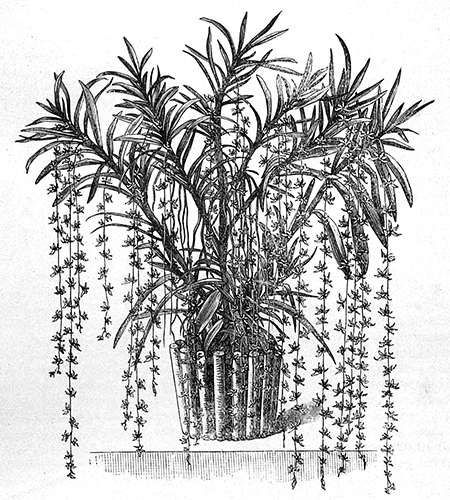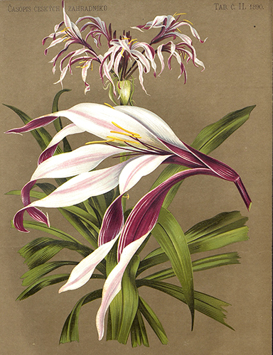 Dimorphorchis lowii (tehdy Vanda lowii). Orchidej zakoupená Theodorem baronem Hrubým z Jelení kolem r. 1873 v Hamburku za 75 franků. Po rozkvetení v červnu 1883 se stala evropskou senzací. Frederick Sander ji chtěl získat do svého anglického zahradnictví a baronu Hrubému bezvýsledně nabídl částku 5 000 franků. Obrázek, vzniklý nejspíše na základě vyobrazení Katy (Kateřiny) Maškové-Buškové, otiskla v r. 1884 všechna významná evropská botanicko- -zahradnická periodika. Deutsche Gärtner-Zeitung, 20. března 1884