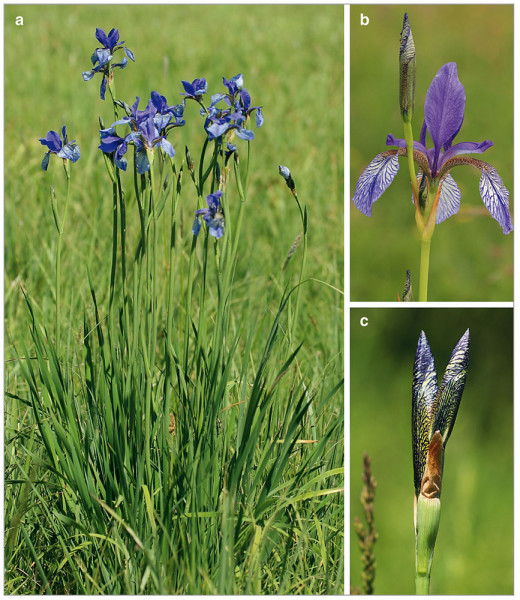 Kosatec sibiřský (Iris sibirica) má listeny zelené, aspoň zčásti blanité (suchomázdřité) a vnější okvětní lístky mají na svrchní straně fialové žilkování na bílém podkladu. Tento druh se běžně pěstuje v kultuře a může zplaňovat. Koláž k problematice určování druhu, připravené pro plánovaný Fotografický atlas rostlin ČR (www.fotoatlas-rostlin.cz), poskytla Alena Lepší. Foto J. Lukavský (celkový habitus), L. Zdařil (květ) a F. Lamla (listen)