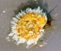 Kolonie epibiontů (plísenka rodu Epistylis) na ulitě terčovníka vroubeného (Planorbis planorbis) tvoří objemnou biomasu, díky níž je plž sice méně nápadný, avšak tato „ozdoba“ mu může znesnadňovat pohyb. Foto J. Bulantová