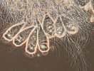 Několik jedinců plísenky (Epistylis sp.) z mohutné kolonie přichycené rozvětvenými stopkami na ulitu plovatky bahenní (Lymnaea stagnalis). Každá z nálevek má věnec brv, jimiž prvoci filtrují potravu z okolí, např. zelené řasy, které dodávají potravním vakuolám nálevníka zelené zbarvení. Nativní preparát, Nomarského kontrast, zvětšeno 400×. Foto J. Bulantová
