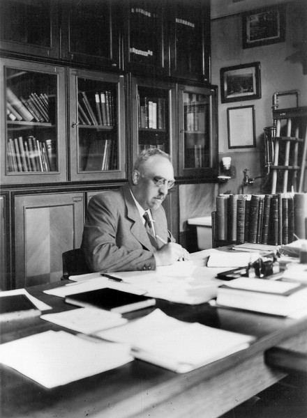 Josef Podpěra v pracovně v Kotlářské ulici r. 1941. Zbytek botanického ústavu tehdy pracoval pod dohledem říšského komisaře, profesora německé techniky v Brně Franze Frimmela von Traisenau. Z fotoarchivu Ústavu botaniky a zoologie Přírodovědecké fakulty Masarykovy univerzity, historické diapozitivy naskenoval K. Chytrý