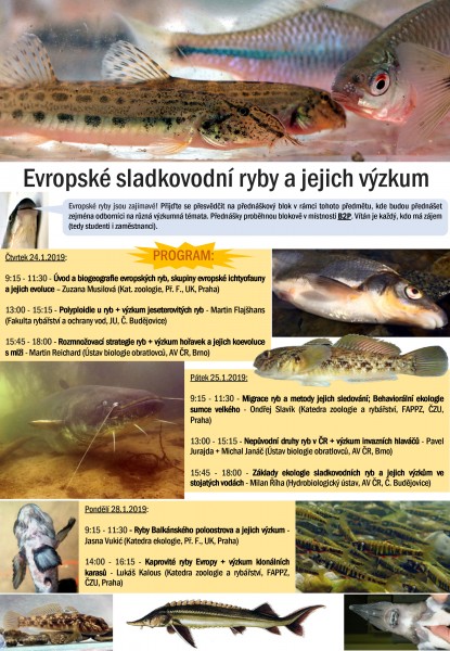 Evropské ryby jsou zajímavé! Přijďte se přesvědčit na přednáškový blok v rámci tohoto předmětu, kde budou přednášet zejména odborníci na různá výzkumná témata. Přednášky proběhnou blokově v místnosti B2P na PřF UK, Viničná 7, Praha 2. Vítán je každý, kdo má zájem (tedy studenti i zaměstnanci).