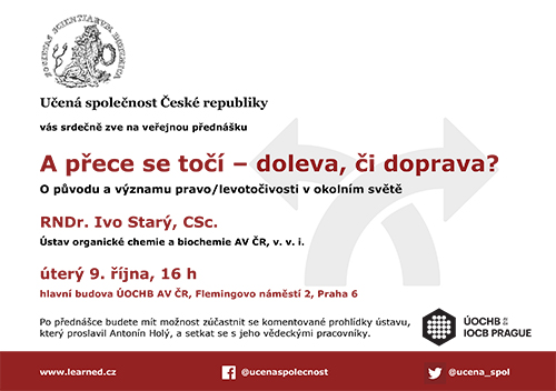 Učená společnost České republiky vás srdečně zve na veřejnou přednášku RNDr. Iva Starého, CSc. (Ústav organické chemie a biochemie AV ČR, v. v. i.) A přece se točí – doleva, či doprava?