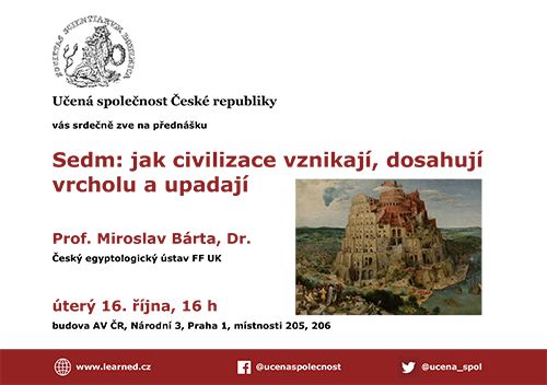 Učená společnost ČR si Vás dovoluje pozvat na přednášku prof. Mgr. Miroslava Bárty, Dr. (Český egyptologický ústav FF UK) s názvem Sedm: jak civilizace vznikají, dosahují vrcholu a upadají se koná v úterý 16. 10. 2018 v 16:00 hod. v místnostech 205, 206 budovy AV ČR, Národní 3, Praha 1.