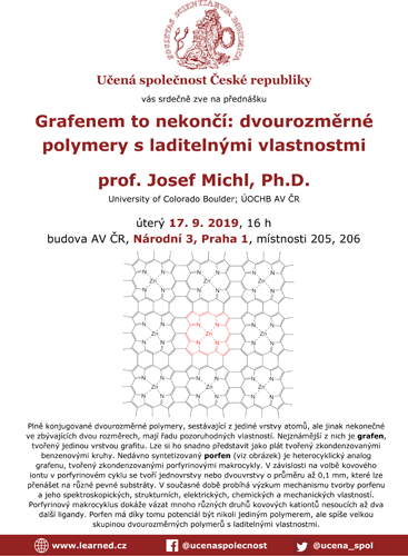 Přednášku na téma "Grafenem to nekončí: dvourozměrné polymery s laditelnými vlastnostmi" pronese prof. Josef Michl, Ph.D. (University of Colorado Boudler; Ústav organické chemie a biochemie AV ČR, v. v. i.).