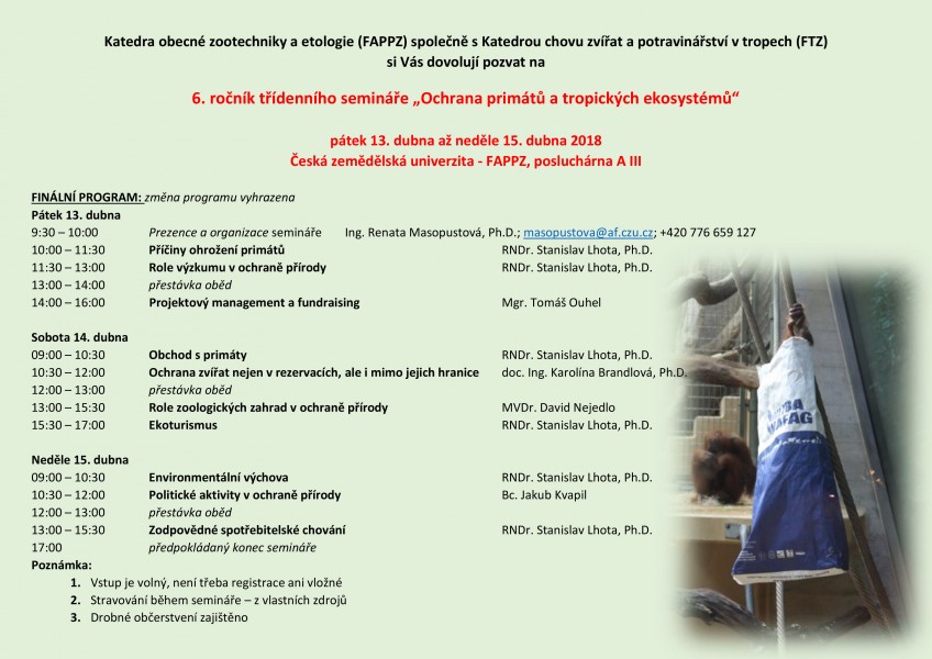 Katedra obecné zootechniky a etologie (FAPPZ) společně s Katedrou chovu zvířat a potravinářství v tropech (FTZ) si Vás dovolují pozvat na 6. ročník třídenního semináře Ochrana primátů a tropických ekosystémů
