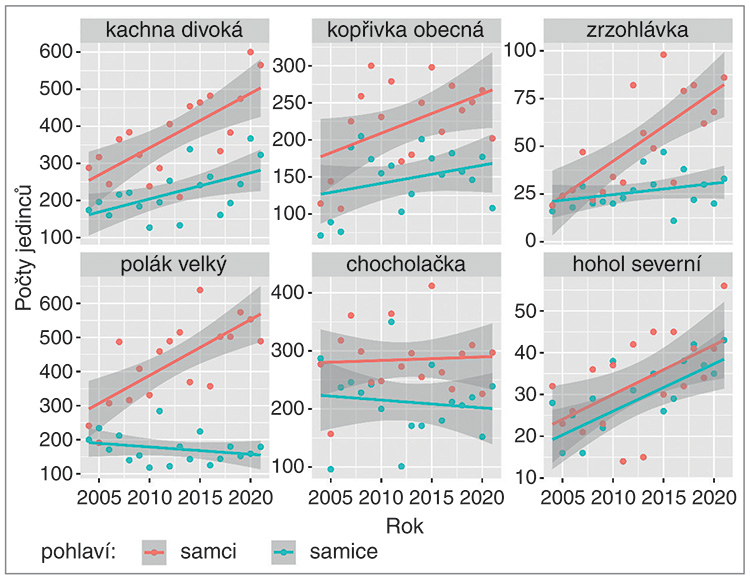 Waterbird breeding populations in the Czech Republic have undergone significant changes in the last 100 years, which exceed in scale the changes in other animal groups. A key tool for understanding these changes is the long-term monitoring of breeding populations, which provides data on the status of individual species in the target area, including the identification of alarming negative changes. Only monitoring the total number of adults may not reveal the unfavourable status of breeding populations in the target area, i.e. a male-skewed sex ratio and lower reproductive success, resulting in a lower number of females rearing ducklings and a lower number of ducklings.