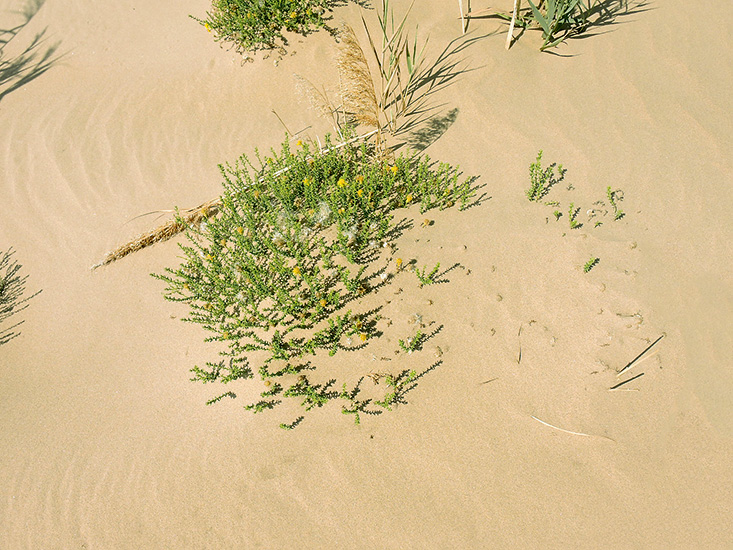 Oman Inula salsoloides odnožuje z horizontálně rostoucích kořenů a díky tomuto způsobu klonálního růstu se dokáže vyrovnat jak s hromaděním, tak s úbytkem substrátu. Vnitřní Mongolsko, Bayannur, Čína. Foto J. Klimešová