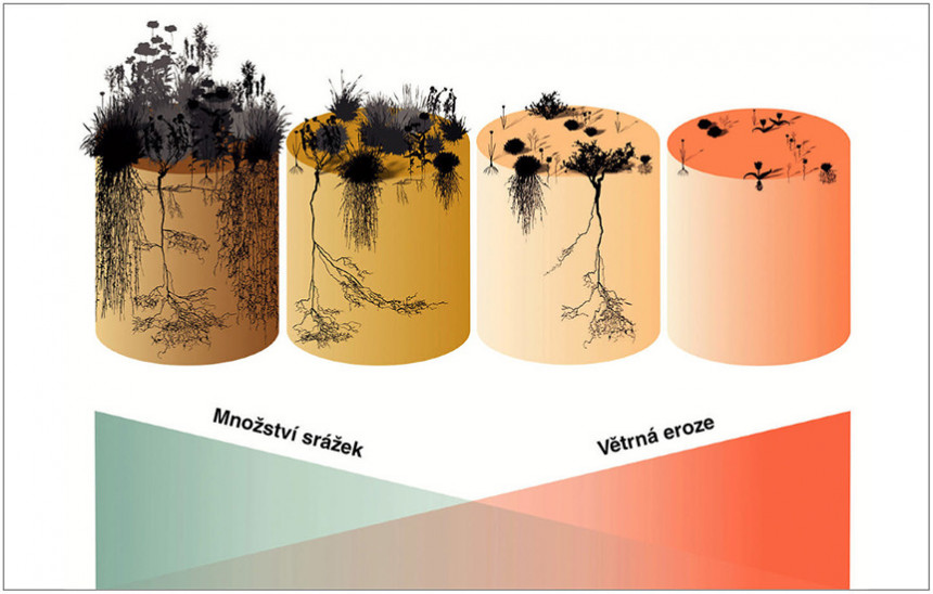 Změny v zastoupení různých typů kořenových systémů na gradientu snižujících se srážek od trávníků do polopouští. Jako předloha pro vyobrazení kořenových systémů sloužila práce J. E. Weavera (1919). Orig. A. Bartušková