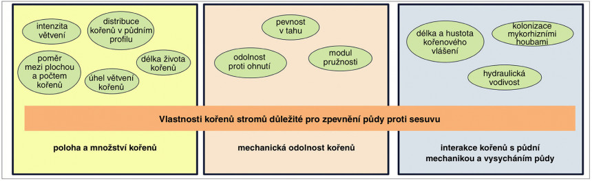 Vlastnosti kořenů stromů důležité pro jejich schopnost zpevnit půdy proti sesuvu. Upraveno podle: G. T. Freschet a kol. (2021)