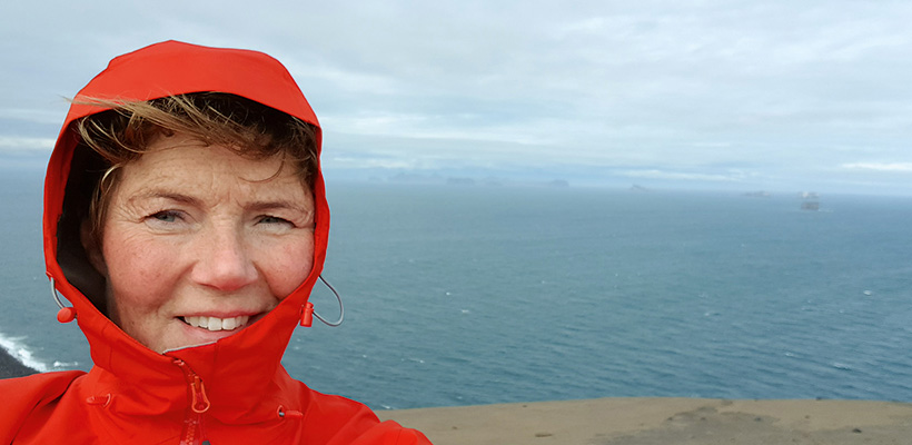 Rostlinná ekoložka Járngerður Grétarsdóttir z Islandského přírodovědeckého institutu, členka biologických expedic na Surtsey, na jeho vrcholu v r. 2020. V pozadí jsou vidět další, starší ostrovy souostroví Vestmannaeyjar – Ostrovy západních mužů. Foto J. Grétarsdóttir