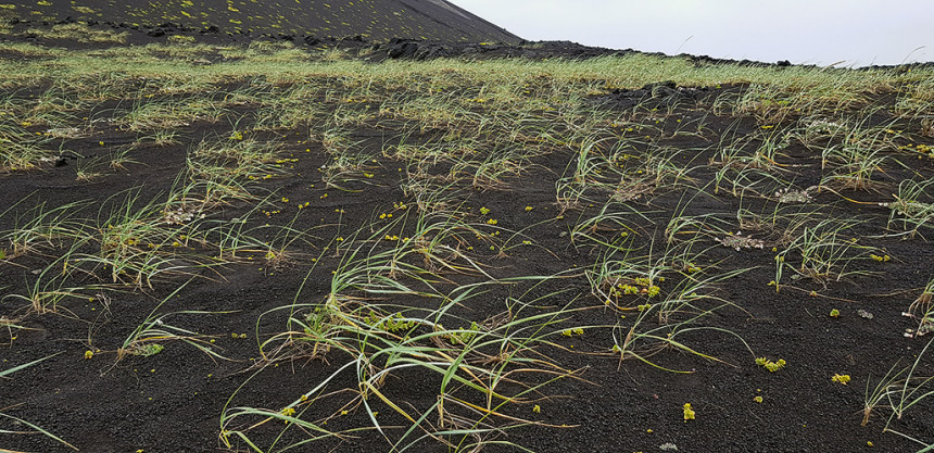 Ječmenice písečná (Leymus arenarius) pokrývá surtseyskou vulkanickou polární poušť a zabraňuje jejímu rozšiřování podobně jako na velkých islandských pouštích. Má několik metrů dlouhé kořeny. Ve větru se její listy pohybují krouživým pohybem a vytvářejí obrazce v písku. Foto J. Grétarsdóttir