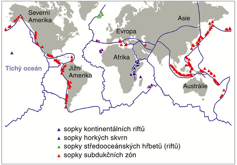 Distribuce aktivních vulkánů vystupujících nad mořskou hladinu na Zemi vzhledem k jejich geotektonické pozici. Jsou také zobrazeny hranice hlavních litosférických desek. Orig. V. Rapprich