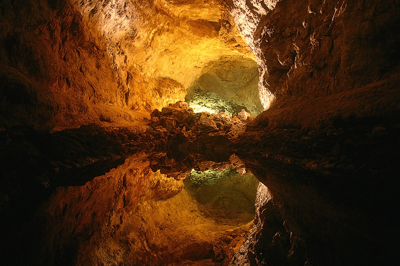 Lávový tunel Jameos del Aqua na Lanzarote. Pokud se láva pohybuje příhodnou rychlostí, utuhnou její okraje do podoby pevné slupky, ale vnitřek lávového proudu odteče. Prostředí v tunelu neruší ani vánek a v dokonale hladké vodní hladině se zrcadlí jeho obraz. Foto V. Rapprich