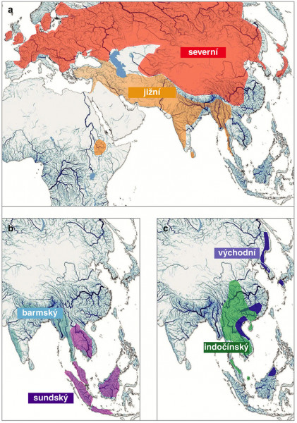 Rozšíření jednotlivých kladů čeledi Nemacheilidae v rámci Eurasie: severní a jižní (a), barmský a sundský (b), východní a indočínský klad (c). Upraveno podle: V. Šlechtová a kol. (2025)