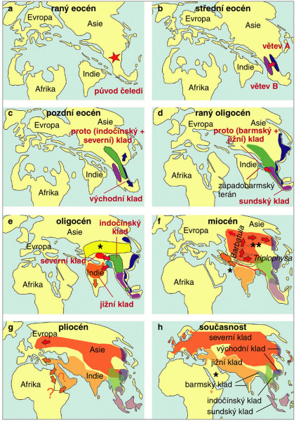 Paleomapy znázorňující časové a prostorové souvislosti hlavních událostí v evoluční historii čeledi Nemacheilidae na území Eurasie. Raný eocén – původ před 48 miliony let (a); střední eocén – rozdělení na větve A a B před 39 miliony let (b); pozdní eocén – oddělení kladů 36 milionů let (c); raný oligocén – oddělení kladů před 33 miliony let (d); oligocén – aridizace 34–23 milionů let (*), jižní klad 30 milionů let (e); miocén – rozšíření před 20 miliony (*) a 20–10 miliony let (**; f); pliocén – šíření před 5,6–3,0 milio ny let (g); současnost – pleistocenní aridizace (*, h). Upraveno podle: V. Šlechtová a kol. (2025)