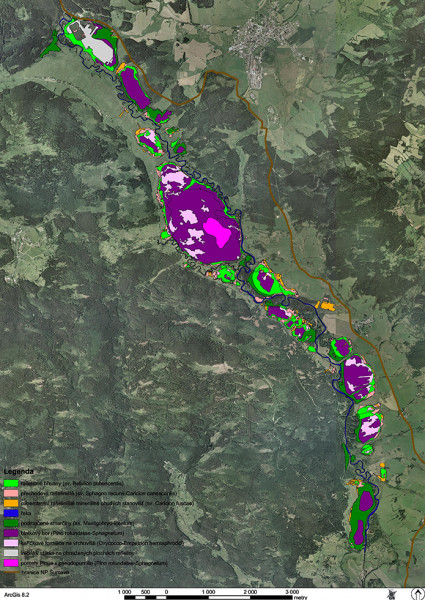 Zjednodušená vegetační mapa zachycující oblast na soutoku Teplé a Studené Vltavy. 1 – rašelinné březiny, 2 – sukcesní rašelinný les, 3 – ostřicová rašeliniště, 4 – podmáčené smrčiny, 5 – předlesní sukcesní stadia, 6 – svahové vlhké louky, 7 – ruderální vegetace, 8 – řeka, 9 – vodní makrofyty tůní, 10 – vysoké ostřice a rákosiny, 11 – vysokobylinné mokré louky, 12 – vlhké aluviální louky, 13 – mokřadní vrbiny, 14 – porosty tavolníku vrbolistého, 15 – pobřežní vrbiny, 16 – rašelinné smrčiny, 17 – blatkový bor, 18 – otevřené vrchoviště s keříčkovou vegetací, 19 – obnažená rašelina. Orig. I. Bufková