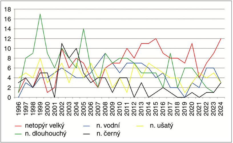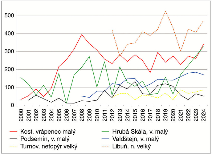 Počty zimujících netopýrů na 8 nejdéle sledovaných zimovištích v oblasti Českého ráje – Hrubá Skála, Hrubý Rohozec, Kost, štola v národní přírodní památce Kozákov, Krtola, zámek Mnichovo Hradiště a Valdštejn. Patrný je pokles počtu nálezů netopýra černého (Barbastella barbastellus) a n. dlouhouchého (Plecotus austriacus). Údaje z let 1985–2001 podle Z. Mrkáčka a kol. (2001), z let 2002–24 podle autorů článku