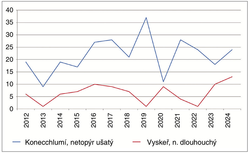 Počty netopýra ušatého (Plecotus auritus) a n. dlouhouchého (P. austriacus) ve vybraných letních koloniích. Údaje z let 1985–2001 podle Z. Mrkáčka a kol. (2001), z let 2002–24 podle autorů článku