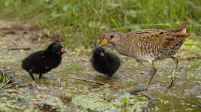 Chřástal kropenatý (Porzana porzana) s mláďaty v revitalizované části území v r. 2023. Foto J. Šťastný