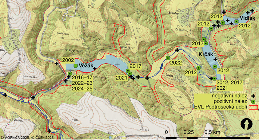Rozšíření sekavce podunajského v části evropsky významné lokality Podtrosecká údolí. Podle: Nálezová databáze ochrany přírody Agentury ochrany přírody a krajiny ČR