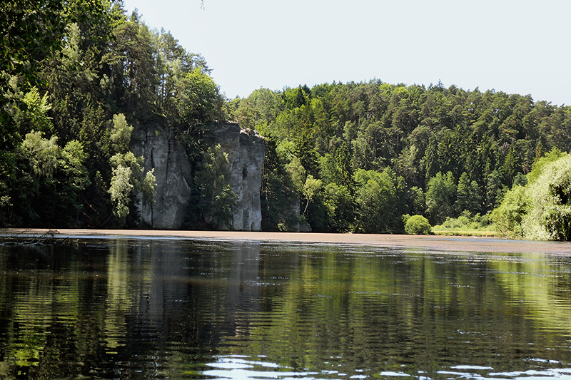 Rybník Věžák s bohatými porosty ponořených makrofytů, např. bublinatkou jižní (Utricularia australis), růžkatcem ostnitým (Cerathophyllum demersum), rdestem kadeřavým (Potamogeton crispus) i vzácnějším r. alpským (P. alpinus), a pískovcovými stěnami na březích tvoří hlavní centrum výskytu populace sekavce podunajského v Podtroseckých údolích. Foto P. Blabolil