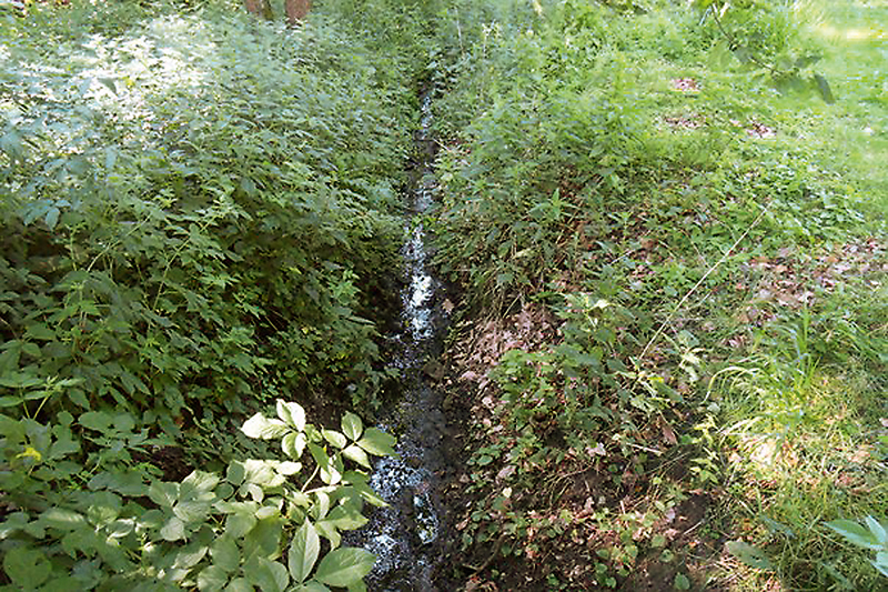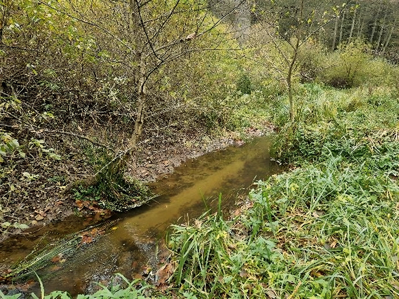 Přehled různorodého prostředí obývaného sekavcem podunajským v EVL Podtrosecká údolí. Jordánka pod rybníkem Vidlák teče úzkým a historicky regulovaným korytem s bahnitým dnem, které zarůstá terestrickou vegetací. Foto M. Muška a P. Blabolil