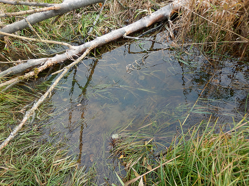 Přehled různorodého prostředí obývaného sekavcem podunajským v EVL Podtrosecká údolí. Přítoková část rybníka Věžák s rozsáhlými a hlubokými bahnitými nánosy a bohatým porostem zelených vláknitých řas – ideální stanoviště sekavce. Foto M. Muška a P. Blabolil