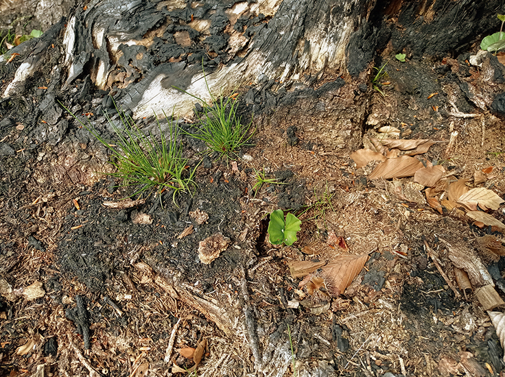 Začátek prvního jara po požáru v NP České Švýcarsko. Vedle pionýrských druhů rostlin a dřevin může dojít i k podpoře obnovy stínomilných dřevin, např. pomocí semen z požárem poškozených dospělých buků lesních (Fagus sylvatica). Klíčící jedinci buku (uprostřed vpravo a vpravo nahoře). Foto R. Bače