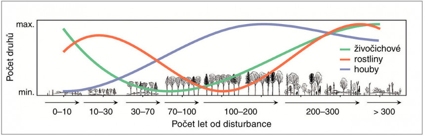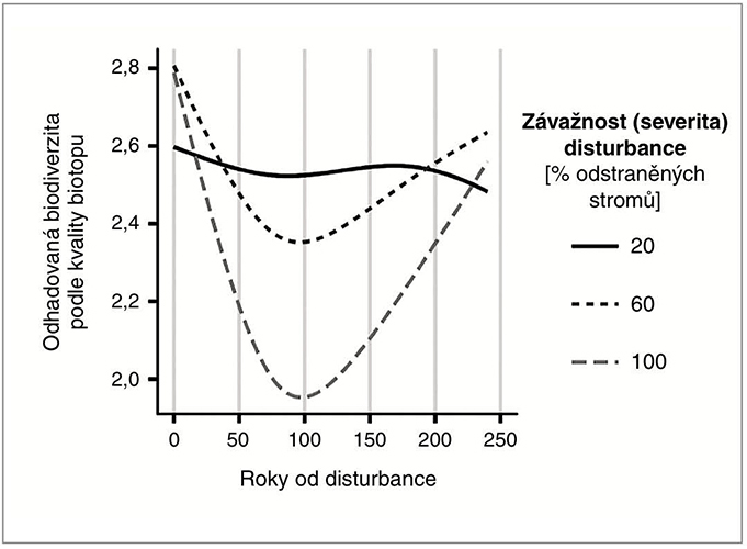 Změna indexu biodiverzity (odvozená podle kvality a kvantity biotopů) v závis losti na čase a síle disturbance. Bezprostředně po narušení bývá biodiverzita vysoká díky světlu, teplu a množství zdrojů. V následujících desetiletích se však porost zahušťuje a podmínky se zhoršují – tím hlouběji, čím silnější disturbance původně byla. Teprve ve stáří lesa se opět objevují prvky struktury (velké stromy, mrtvé dřevo), které kvalitu stanoviště zvyšují. Upraveno podle: R. Bače a kol. (2023)