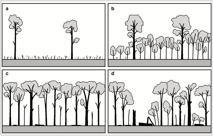 Sukcese v nížinných lesích, od raně sukcesního stavu (a) přes fázi dorůstání (b) a plně vzrostlý les (c) až k pozdní fázi (d). V nížinných lesích je dnes frekvence rozsáhlejších přirozených disturbancí malá, pozdní fáze sukcese pak bývají často příliš tmavé. Po pádu starých stromů vznikají většinou pouze malé světliny, které se ale v důsledku vysoké konkurence stromů opět rychle zapojí. To je značným omezením pro přežívání světlomilných organismů. Upraveno podle: V. Lanta a kol. (2025)