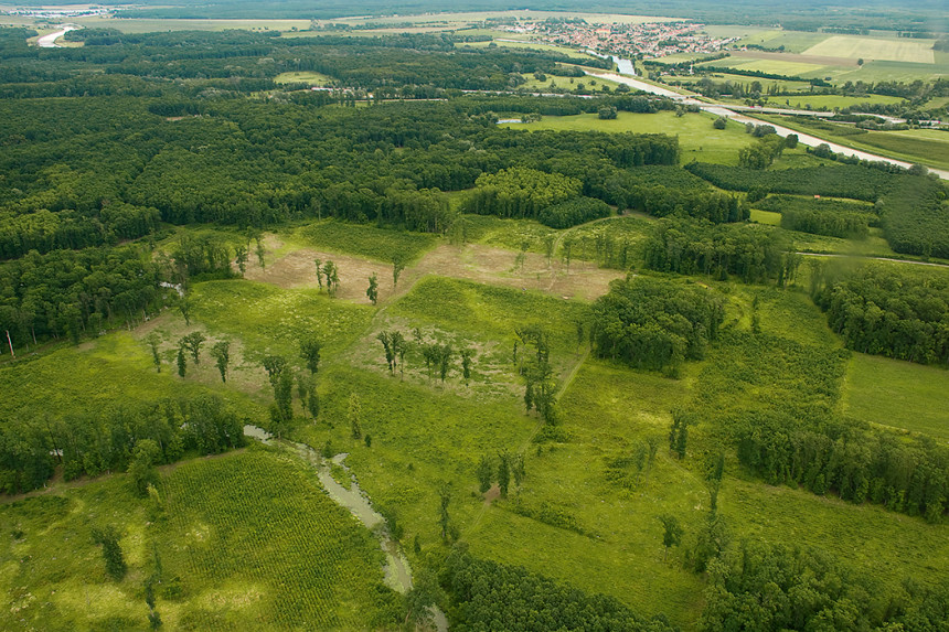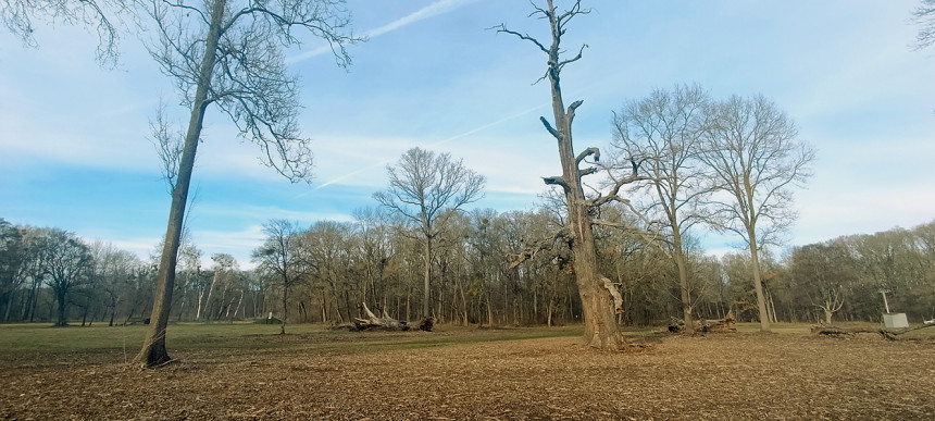 Tento snímek z r. 2021 velmi dobře ilustruje dosavadní intenzivní způsob lesního hospodaření v lužních lesích CHKO Soutok, kdy v těsné blízkosti národní přírodní rezervace Ranšpurk (dnes součást NPR Lanžhotské pralesy) proběhla holosečná těžba s přípravou půdy frézováním. Ano, to co vypadá jako pole, je ve skutečnosti paseka připravená k zalesnění. Na plot rezervace, který chrání území proti zvěři, nikoli proti lidem, navazuje plot tzv. obnovního bloku, aby byly sazenice ochráněny před okusem. Foto L. Čížek