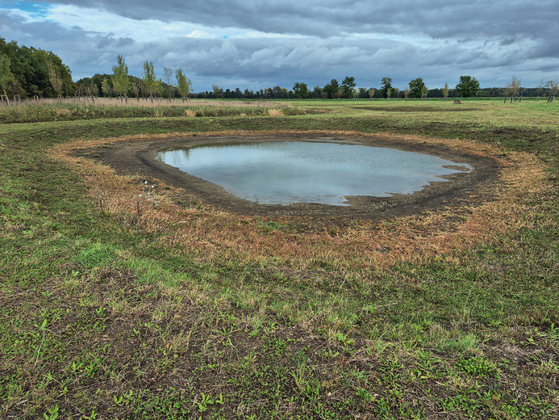 Ikonické staroduby na nivních loukách na Pohansku se postupně rozpadají, proto AOPK ČR finančně podporuje nové výsadby, které odumírající velikány v budoucnu nahradí. Výsadba u zámečku Lány v r. 2025. Foto Archiv AOPK ČR