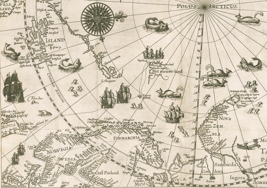 Výřez z mapy zhotovené r. 1598 podle objevů třetí Barentsovy expedice z let 1596–97 (blíže v textu). Mapa zachycuje trasu expedice a historicky první kartografické znázornění Svalbardu, označeného zde Hetnieuwe land. Převzato z Wikimedia Commons v souladu s podmínkami použití