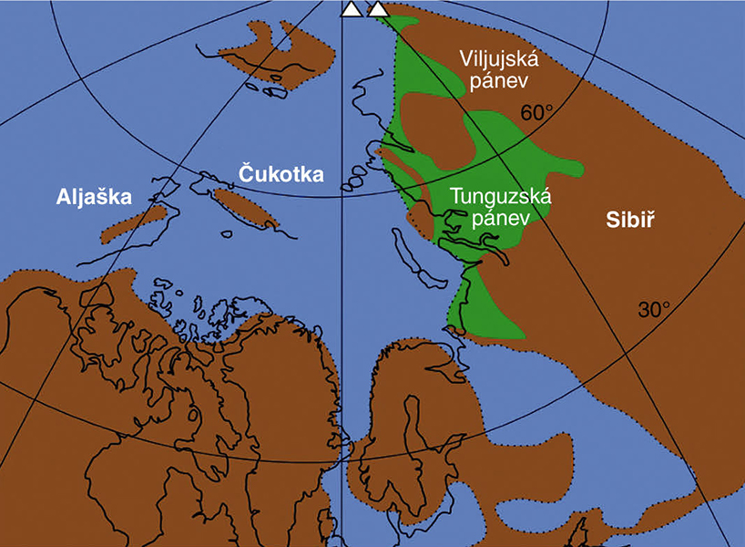 Severní Pangea ve druhé polovině permu před 269–251 miliony let. Modře moře, hnědě souš, zeleně arktické nížiny, bílé trojúhelníky – mořský zámrz (?), zalednění (?). Zdroj: J. Golonka a kol. (2003), upraveno