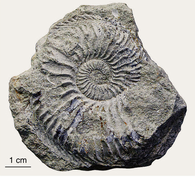 Boreální amonit rodu Cardioceras nalezený ve vrstvách subtropického moře pozdní jury u Olomučan (160 milionů let). Zaniklý život na Moravě, expozice v Mo ravském zemském muzeu. Foto P. Hykš