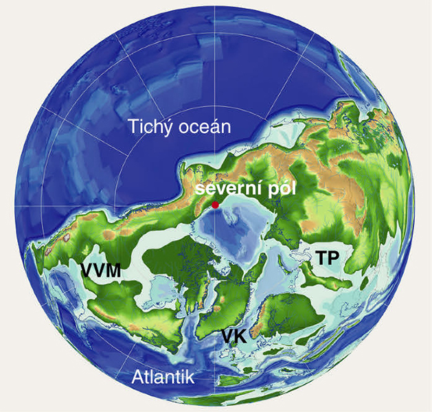 Země v pozdní křídě před 70 miliony let. TP – Turgajský průliv, VVM – Velké vnitrozemské moře, VK – Vikingský koridor. Podle: P. J. Markwick a P. J. Valdes (2004) a P. J. Markwick (2007), s laskavým svolením (https://www.knowing.earth/maps-and-figures.html)