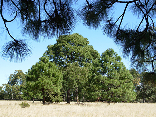 Větev v popředí a skupina stromů borovice mičoakánské (P. devoniana), druhu s nejdelšími jehlicemi plodných větví na světě, který byl Roezlem popsán pod čtyřmi platnými druhovými jmény. Pohoří okolo hranic mexických států Zacatecas a Jalisco. Foto R. Businský (únor 2007)