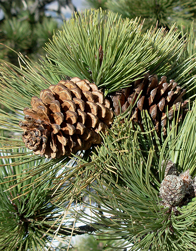 Plodná větev borovice Hartwegovy se dvěma čerstvě otevřenými šiškami a jednoletými šišticemi (vpravo dole). Ve výšce 3 670 m n. m. na hoře Cerro Potosí v mexickém státě Nuevo León. Foto R. Businský (únor 2007)