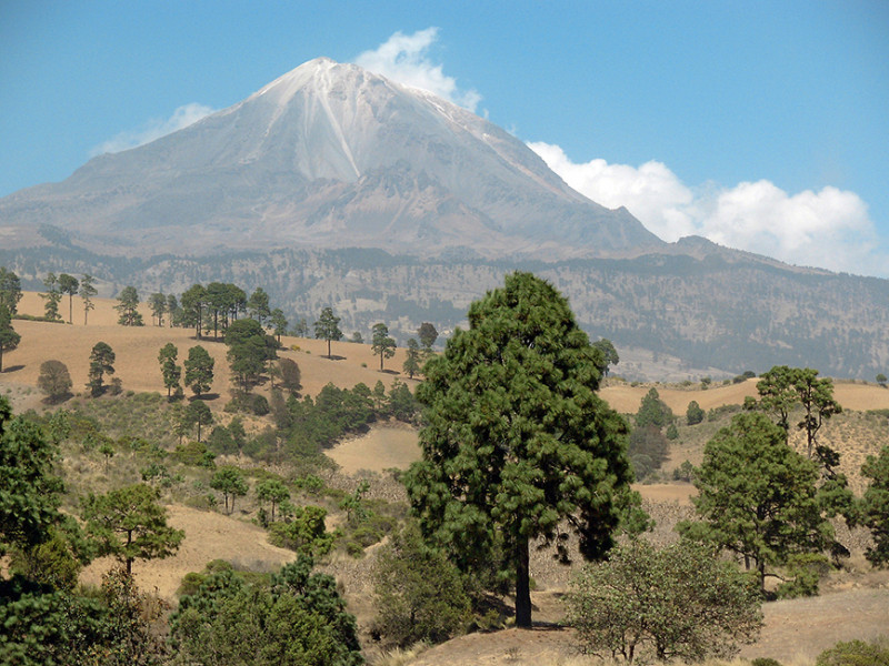 Solitérní strom borovice Montezumovy (Pinus montezumae) v popředí uprostřed a rozvolněné porosty stromů b. Hartwegovy (P. hartwegii) na blízkém i vzdáleném pozadí pod nejvyšší horou Mexika, Pico de Orizaba (Citlaltepetl) v březnu 2007. První z těchto druhů byl Benediktem Roezlem popsán pod 39 a druhý pod 12 platně publikovanými, ale pozdějšími badateli nepřijatými, druhovými jmény v dobré víře, že všechna jména reprezentují samostatné druhy. Foto R. Businský