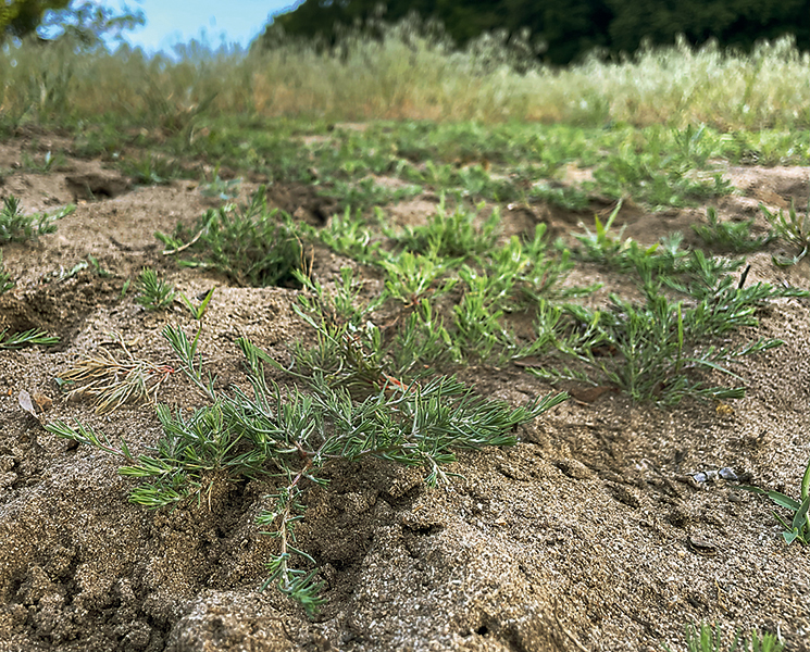 Chruplavník rolní (Polycnemum arvense) je konkurenčně slabý druh písčin, vyžaduje pravidelné narušování půdního povrchu. Hrúd Dúbravka. Foto K. Chytrý