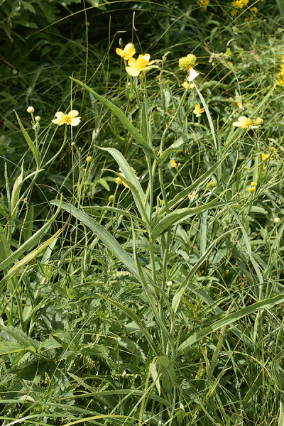 Zarůstající zaplavované nivní louky podél menších toků hostí dnes už vzácnou kombinaci vysokostébelných a vysokobylinných "praluk" s pestrobarevnou kombinací porostů purpurové kypreje vrbice (Lythrum salicaria), modrofialového rozrazilu dlouholistého (Veronica maritima) a žlutého pryskyřníku velkého (Ranunculus lingua, na snímku). Foto A. a T. Kučerovi