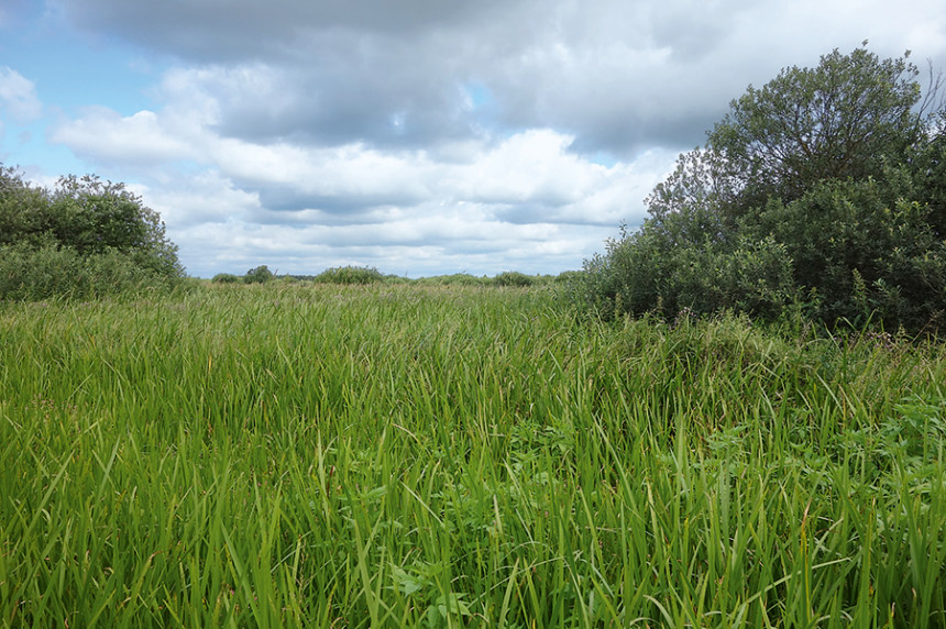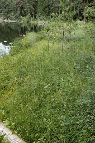 Méně druhů kvetoucích vysokých bylin najdeme v porostech nepůvodního puškvorce obecného (Acorus calamus). Foto A. a T. Kučerovi