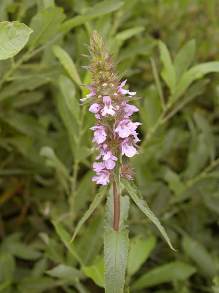 Tzv. pralouky jsou nivní vysoko-(stébelné+bylinné) porosty ladních luk, nesečené nebo jen výjimečně sečené, spíše v minulosti pasené velkými býložravci, tvořené převážně tzv. klonálními druhy, takže jen pomalu zarůstají náletem dřevin. Občasné zatopení a okus dřevin je zřejmě udržuje nezarůstající. Z běžnějších druhů v nich roste vrbina obecná (Lysimachia vulgaris), kyprej vrbice (Lythrum salicaria) a sadec konopáč (Eupatorium cannabinum), tužebník jilmový (Filipendula ulmaria) a čistec bahenní (Stachys palustris, na snímku). Foto A. a T. Kučerovi