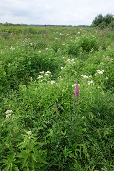 Tzv. pralouky jsou nivní vysoko-(stébelné+bylinné) porosty ladních luk, nesečené nebo jen výjimečně sečené, spíše v minulosti pasené velkými býložravci, tvořené převážně tzv. klonálními druhy, takže jen pomalu zarůstají náletem dřevin. Občasné zatopení a okus dřevin je zřejmě udržuje nezarůstající. Z běžnějších druhů v nich roste vrbina obecná (Lysimachia vulgaris), kyprej vrbice (Lythrum salicaria, na snímku) a sadec konopáč (Eupatorium cannabinum), tužebník jilmový (Filipendula ulmaria) a čistec bahenní (Stachys palustris). Foto A. a T. Kučerovi