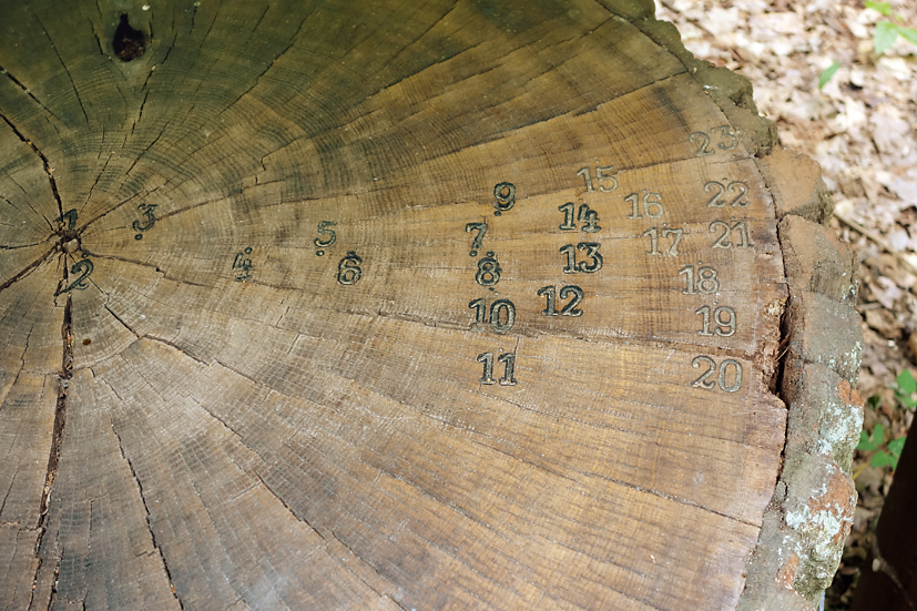 Datované letokruhy od r. 1824 na pařezu dvousetletého dubu letního, bod 11 značí rok 1926 – založení rezervace Czerwone Bagno, Biebrzański Park Narodowy, další čísla připomínají milníky polské historie. Foto A. a T. Kučerovi