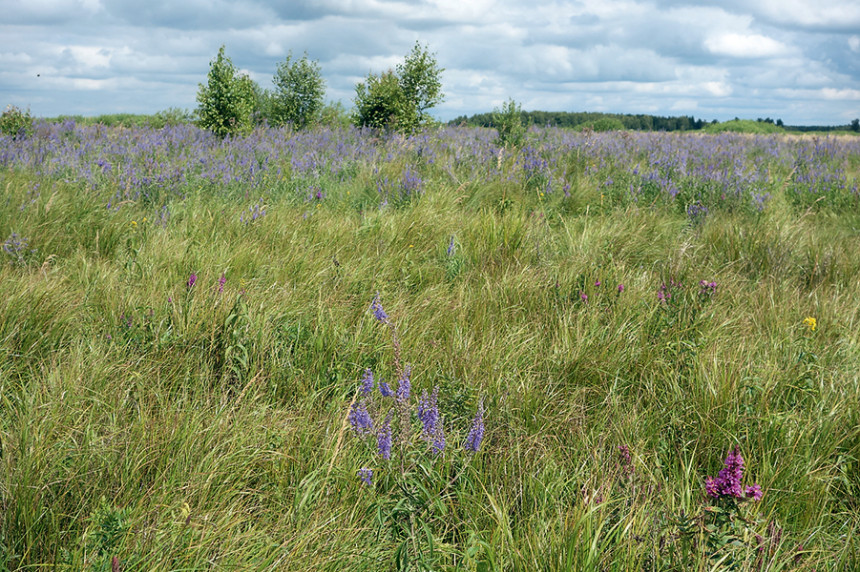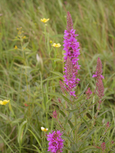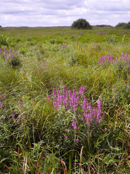 Zarůstající zaplavované nivní louky podél menších toků hostí dnes už vzácnou kombinaci vysokostébelných a vysokobylinných "praluk" s pestrobarevnou kombinací porostů purpurové kypreje vrbice (Lythrum salicaria, na snímku), modrofialového rozrazilu dlouholistého (Veronica maritima) a žlutého pryskyřníku velkého (Ranunculus lingua). Foto A. a T. Kučerovi